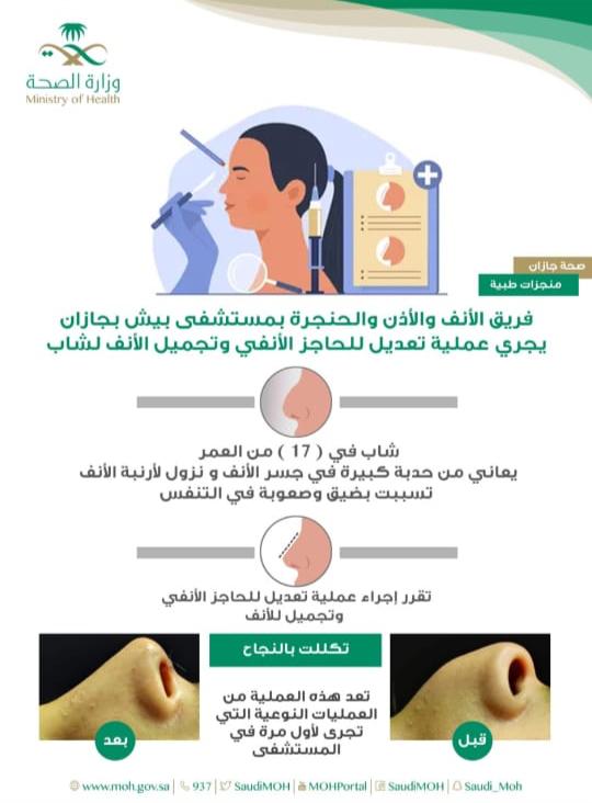 أجرى فريق الأنف والأذن والحنجرة بمستشفى بيش بجازان، أول عملية تعديل للحاجز الأنفي وتجميل الأنف لشاب في ال ١٧ من العمر كان يعاني من حدبة كبيرة في جسر الانف ونزول لأنفة الأنف تسببت بضيق وصعوبة في التنفس