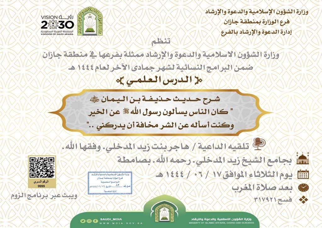 ينظم فرع وزارة الشؤون الإسلامية والدعوة والإرشاد و ضمن البرامج النسائية لشهر جمادى الآخر لعام 1444 هـ , مساء اليوم الثلاثاء الموافق 17 / 6 / 1444 هـ , ( الدرس العلمي ) شرح حديث حذيفة بن اليمان – رضي الله عنه – ” كان الناس يسألون رسول الله صلى الله عليه وسلم عن الخير وكنت أسأله عن الشر مخافة أن يدركني …” وذلك بجامع الشيخ زيد المدخلي – رحمه الله – بمحافظة صامطة بعد صلاة المغرب مباشرة ويُبث الدرس أيضاً عبر تطبيق زوم .
