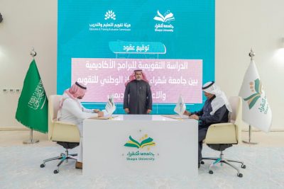 وقعت جامعة شقراء، اليوم الخميس 19 جمادى الثاني 1444هـ الموافق 12 يناير 2023م، اتفاقيات لاعتماد (15) برنامجًا أكاديميًا مع المركز الوطني للتقويم والاعتماد الأكاديمي “اعتماد”، وذلك بمقر الجامعة بمحافظة شقراء، مثل مديره التنفيذي أ.د. محمد بن صالح باشمّاخ، ومثل الجامعة د. منصور بن سعيد المالكي وكيل الجامعة للتطوير والجودة.