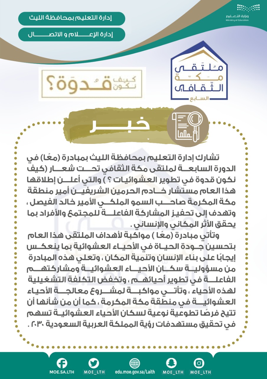 تشارك إدارة التعليم بمحافظة الليث بمبادرة “معًا” في ملتقى مكة الثقافي بدورته السابعة، تحت شعار “كيف نكون قدوة في تطوير العشوائيات؟”، والذي أطلقه هذا العام مستشار خادم الحرمين الشريفين أمير منطقة مكة المكرمة الأمير خالد الفيصل.