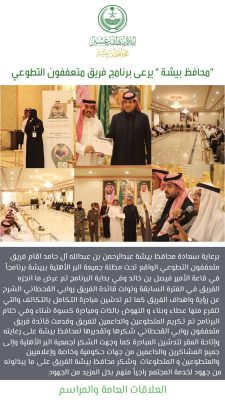 برعاية سعادة محافظ بيشة عبدالرحمن بن عبدالله آل حامد اقام فريق متعففون التطوعي الواقع تحت مظلة جميعة البر الأهلية ببيشة برنامجاً في قاعة الأمير فيصل بن خالد وفي بداية البرنامج تم عرض ما انجزه الفريق في الفترة السابقة وتولت قائدة الفريق روابي القحطاني الشرح عن رؤية واهداف الفريق كما تم تدشين مبادرة التكامل بالتكاتف والتي تتفرع منها عطاء وبناء و النهوض بالذات ومبادرة كسوة شتاء وفي ختام البرنامج تم تكريم المتطوعين والداعمين للفريق وقدمت قائدة فريق متعففون روابي القحطاني شكرها وتقديرها لمحافظ بيشة على رعايته وإتاحة المقر لتدشين المبادرة كما وجهت الشكر لجمعية البر الأهلية وإلى جميع المشاكرين والداعمين من جهات حكومية وخاصة وإعلاميين والمتطوعين و المتطوعات وشكر محافظ بيشة الفريق على ما يبذلونه من جهود لخدمة المجتمع راجياً منهم بذل المزيد من الجهود.
