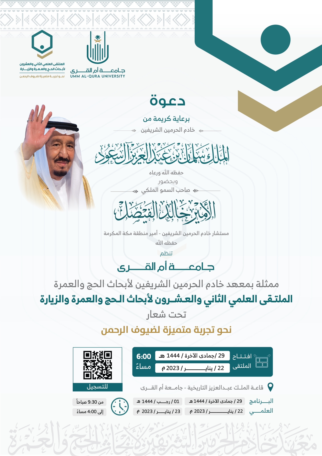 برعاية خادم الحرمين الشَّريفين الملك سلمان بن عبدالعزيز آل سعود -حفظه الله- ، وبحضور صاحب السّموّ الملكي الأمير/ خالد الفيصل بن عبدالعزيز، مستشار خادم الحرمين الشَّريفين أمير منطقة مكَّة المكرَّمة؛ تستعدُّ جامعة أمِّ القُرى ممثَّلة في معهد خادم الحرمين الشَّريفين لأبحاث الحجّ والعمرة والزّيارة للملتقى العلمي الثَّاني والعشرين لأبحاث الحجّ والعمرة والزّيارة؛ وذلك في 29 جمادى الآخرة _ 1 رجب 1444 هـ، الموافق 22-23 يناير 2023م، بقاعة الملك عبدالعزيز التَّاريخية في جامعة أمِّ القرى، تحت شعار: “نحو تجربة متميِّزة لخدمة ضيوف الرَّحمن”.