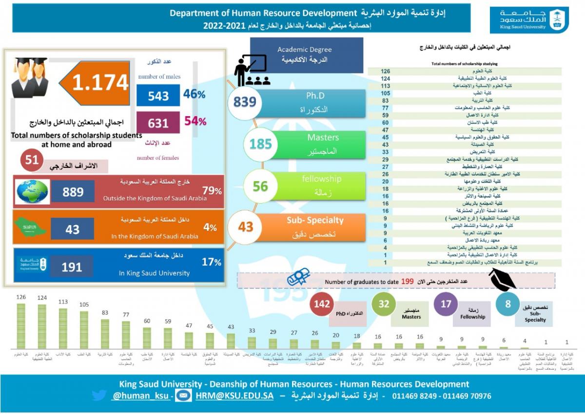 وبين أن عدد المبتعثين من الذكور بلغ (543) بنسبة 46%، والإناث (631) بنسبة 54%، وذلك في بعض الجامعات والجهات داخل المملكة في عدة دول خارجية منها (أمريكا، وبريطانيا، وكندا، وأستراليا، وهولندا، وإسبانيا، وفرنسا، وإيرلندا، وألمانيا، واليابان، وسنغافورة وطاجيكستان، والسويد، والدنمارك، ونيوزيلندا)، وذلك في التخصصات الصحية والعلمية والهندسية والإنسانية.
