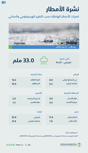 جاء ذلك في تقريرٍ لوزارة البيئة والمياه والزراعة لرصد كميات هطول الأمطار في مناطق المملكة كافة؛ حيث سجَّلت الطائف (16.3) ملم في مركز الشفا، و(14) ملم في مركز الكر بالطائف، وفي منطقة الرياض سجَّل حي المصانع بالرياض (8) ملم، و(6.2) في حي الثمامة بالرياض، بينما سجَّل مطار الأحساء بالمنطقة الشرقية (5.9) ملم، و(4.2) ملم في عريعرة الأحساء، وسجَّلت منطقة القصيم (2.4) ملم في أم الحزم الشمالية، و(1.5) في مطار القصيم، وفي منطقة عسير سجَّلت البشائر بلقرن (11) ملم، وعفران بلقرن (1.0) ملم.