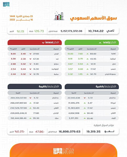 وكانت أسهم شركات: تهامة، وأميانتيت، وصدق، وشمس، ومجموعة فتيحي الأكثر ارتفاعًا, أما أسهم شركات: البحري، وذيب، وسايكو، والجزيرة ريت، وسلامة، الأكثر انخفاضًا في التعاملات, حيث تراوحت نسب الارتفاع والانخفاض بين 10.00 % و 8.00 %.