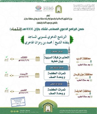 يطلق فرع وزارة الشؤون الإسلامية والدعوة والإرشاد في منطقة جازان مساء اليوم الثلاثاء الرابع والعشرون من شهر جماد الثاني ١٤٤٤ هجرية أولى محاضراته في الأمن الفكري ضمن برامجها الدعوية المصاحبة لشتاء جازان ٢٠٢٣ والتي تستهدف منسوبي المساجد حيث يستهلها فضيلة الشيخ محمد بن رمزان الهاجري بالتحذير من الفرق الضالة والأحزاب المنحرفة ( السرورية ) ثم سيتحدث في اليومين التاليين عن ثمرات توحيد الكلمة والصف واتباع منهج السلف الصالح وعدم الخروج على ولاة الأمر حيث أنها السبيل المهم للخلاص من براثن أهل البغي والفساد وهذه المحاضرات ستقام في ثلاثة جوامع بمحافظات ثلاث ( الدرب – العارضة – فرسان ) .