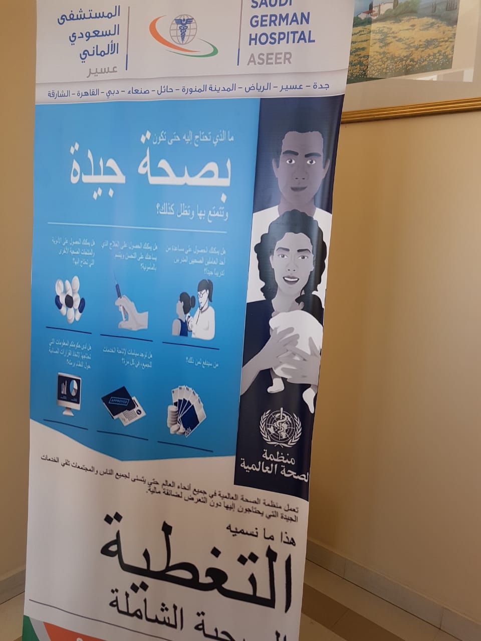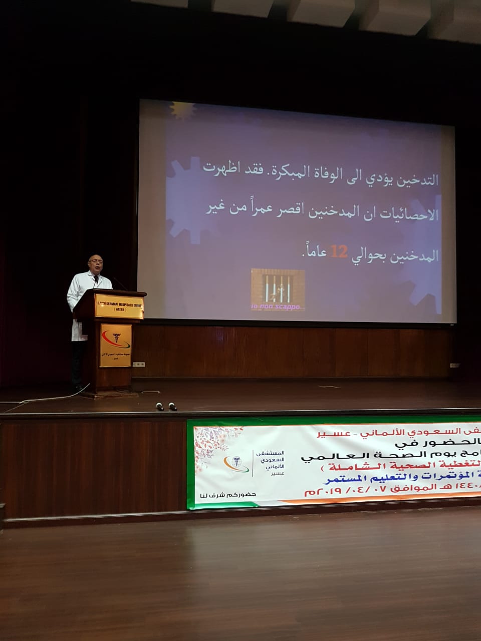 ضمن تفعيل الشراكة المجتمعية الاحد ٧ ابريل يوم الصحة العالمي تحت شعار ( التغطية الصحية الشاملة ) بقاعة المؤتمرات بالمستشفي السعودي الالماني بعسير الفعلية للرجال والنساء بمشاركة الشؤون الصحية وادارة الصحة المدرسية وادارة التعليم وجامعة الملك خالد كلية الطب وكلية الغد الدولية وجمعية العلاج الطبيعي وهيئة الهلال الأحمر وادارة مكافحة التدخين ونادي جولدز جيم وبدا اللقاء الساعة ٩ صباحا واستمر الى ١٢ مساء وعقِبها القاء محاضرة من استشاري طب وجراحة العيون دكتور مأمون عبد العزيز وثم القى الدكتور معتق سعد الشهراني المدير التنفيذي بالمستشفي السعودي .