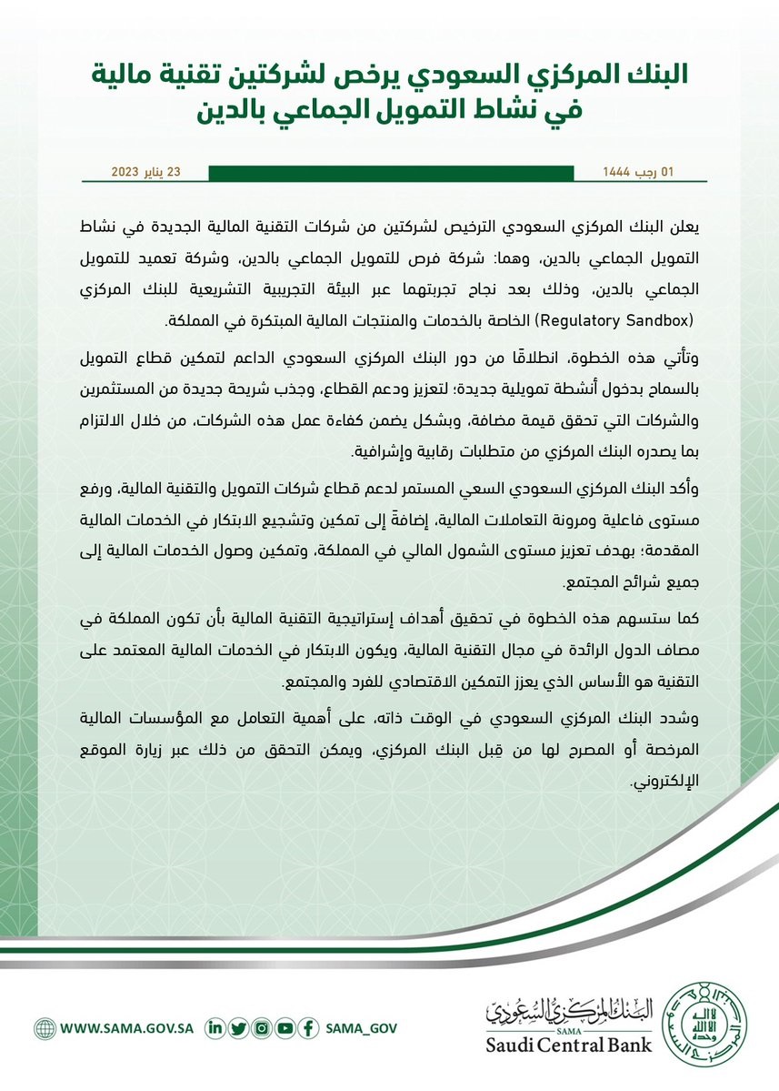 يعلن البنك المركزي السعودي الترخيص لشركتين من شركات التقنية المالية الجديدة في نشاط التمويل الجماعي بالدين، وهما: شركة فرص للتمويل الجماعي بالدين، وشركة تعميد للتمويل الجماعي بالدين، وذلك بعد نجاح تجربتهما عبر البيئة التجريبية التشريعية للبنك المركزي (Regulatory Sandbox) الخاصة بالخدمات والمنتجات المالية المبتكرة في المملكة.