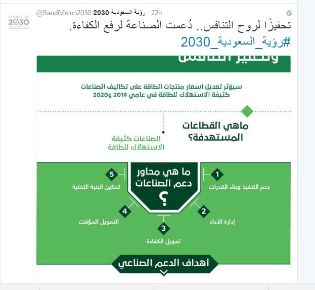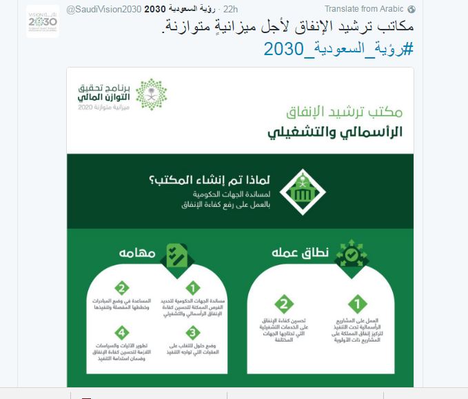 كما استفاض حساب الرؤية في شرح وتوضيح أهمية وأهداف مكتب ترشيد الإنفاق، ومكتب إدارة المشروعات في مجلس الشؤون الاقتصادية والتنمية، حاثًا المواطنين إلى الاقتصاد في استهلاك الطاقة والوقود بعد الحديث عن معدلات الاستهلاك المرتفعة محليًا مقارنةً بمتوسط الاستهلاك العالمي.