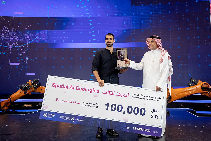 وجاء المركز الثالث من نصيب العمل (Spatial Of Ecologies) وأعضاء الفريق ياسر سنجاب، وفراس سيف الدين، ويبحث هذا العمل الفني القائم على الذكاء الاصطناعي في علم البيئة المكاني وعن أساليب تفاعل مع البيئة متمثلة في طرق كيفيات بيولوجية في البيئة الداخلية وعرضها بالواقع الافتراضي وطباعتها بتقنيات ثلاثية الأبعاد، وتبلغ قيمة الجائزة 100 ألف ريال سعودي.